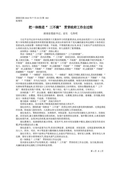 署名文章:2022.07.23湖南省委副书记、省长毛伟明:把一体推进三不腐贯穿政府工作全过程