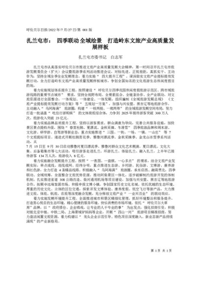 署名文章:2022.07.27扎兰屯市委书记白志军:扎兰屯市:四季联动全域绘景打造岭东文旅产业高质量发展样板