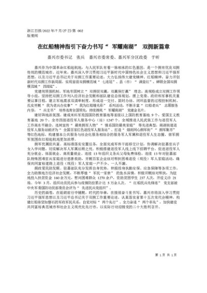 署名文章:2022.07.27嘉兴市委书记张兵嘉兴市委常委、嘉兴军分区政委于昕:在红船精神指引下奋力书写军耀南湖双拥新篇章