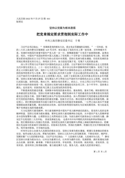 / 署名文章:2022.07.27中共上海市静安区委书记于勇:把党章规定要求贯彻到实际工作中