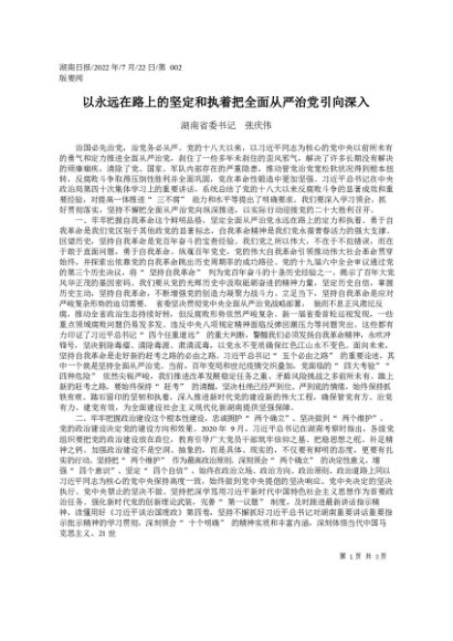 / 署名文章:2022.07.22湖南省委书记张庆伟:以永远在路上的坚定和执着把全面从严治党引向深入