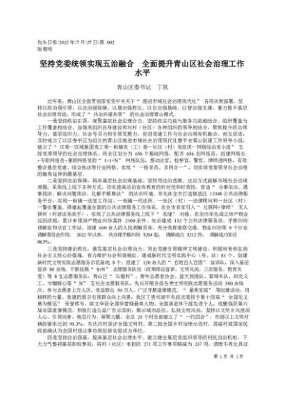 署名文章:2022.07.27青山区委书记丁凯:坚持党委统领实现五治融合全面提升青山区社会治理工作水平