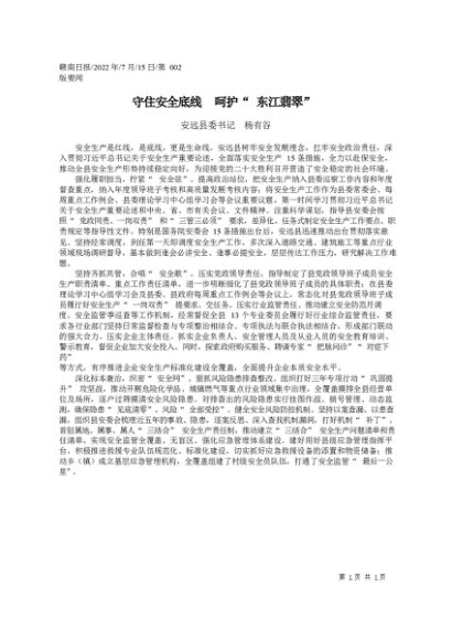 署名文章:2022.07.15安远县委书记杨有谷:守住安全底线呵护东江翡翠