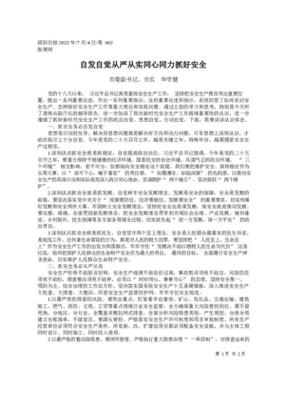 / 署名文章:2022.07.04市委副书记、市长华学健:自发自觉从严从实同心同力抓好安全