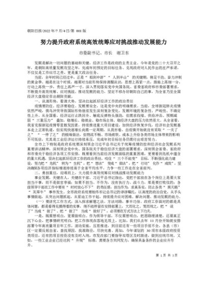 / 署名文章:2022.07.04市委副书记、市长谢卫东:努力提升政府系统高效统筹应对挑战推动发展能力
