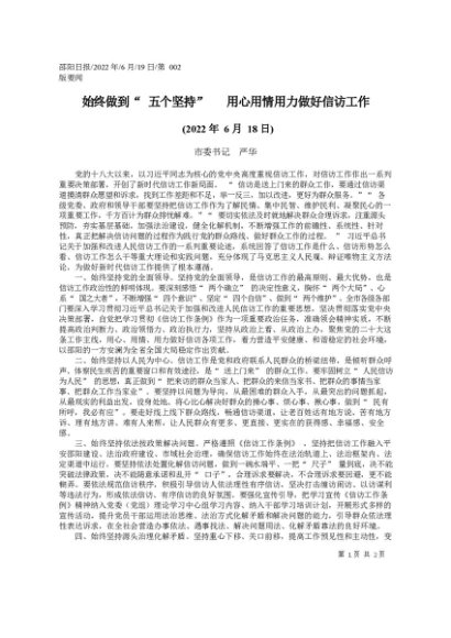 署名文章:2022.06.19市委书记严华:始终做到五个坚持用心用情用力做好信访工作