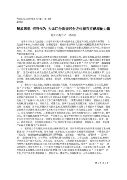 署名文章:2022.06.14海伦市委书记侯绍波:解放思想担当作为为龙江全面振兴全方位振兴贡献海伦力量