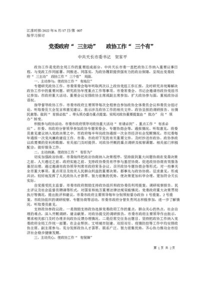 / 署名文章:2022.06.17中共天长市委书记贺家平:党委政府三主动政协工作三个有