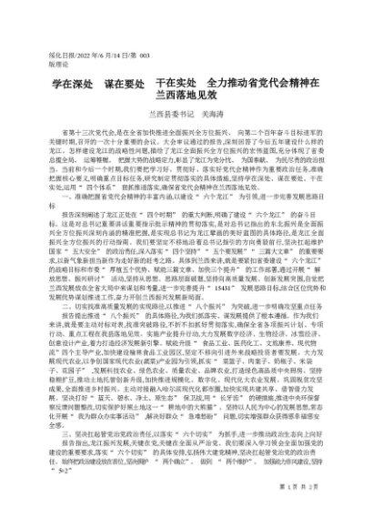 / 署名文章:2022.06.14兰西县委书记关海涛:学在深处谋在要处干在实处全力推动省党代会精神在兰西落地见效