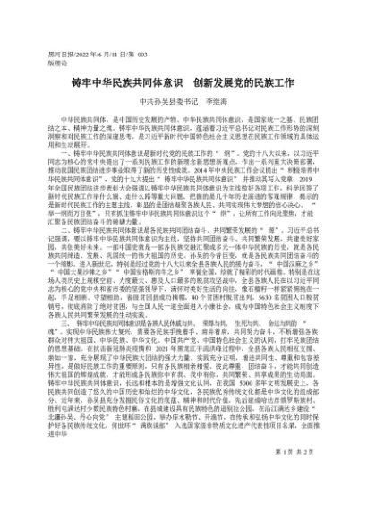 署名文章:2022.06.11中共孙吴县委书记李继海:铸牢中华民族共同体意识创新发展党的民族工作