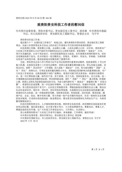 署名文章:2022.05.30中共贵州省委常委、贵阳市委书记、贵安新区党工委书记胡忠雄中共贵阳市委副书记、市人民政府市长贵安新区党工委副书记、管委会主任马宁宇:致贵阳贵安科技工作者的慰问信