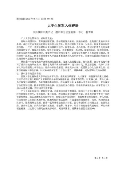 / 署名文章:2022.05.31中共濮阳市委书记濮阳军分区党委第一书记杨青玖:大学生参军入伍寄语