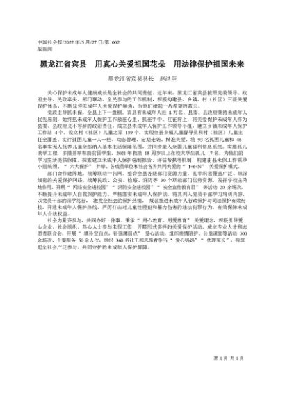 / 署名文章:2022.05.27黑龙江省宾县县长赵洪臣:黑龙江省宾县用真心关爱祖国花朵用法律保护祖国未来