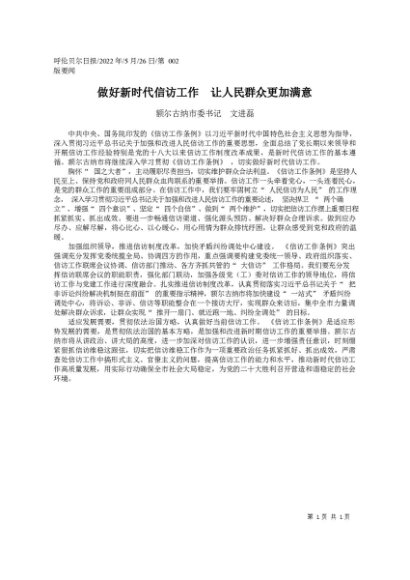/ 署名文章:2022.05.26额尔古纳市委书记文进磊:做好新时代信访工作让人民群众更加满意