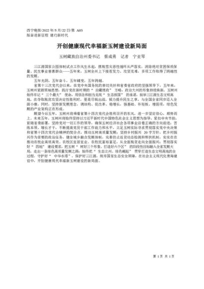 署名文章:2022.05.22玉树藏族自治州委书记蔡成勇记者宁亚琴:开创健康现代幸福新玉树建设新局面