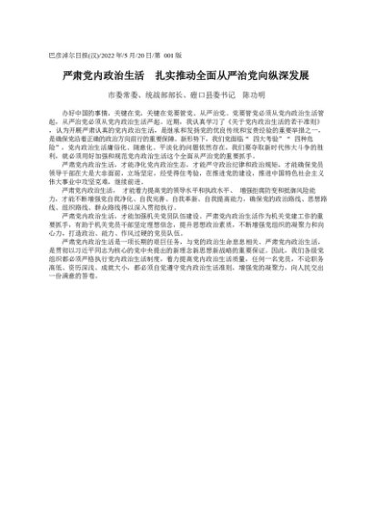 署名文章:2022.05.20市委常委、统战部部长、磴口县委书记陈功明:严肃党内政治生活扎实推动全面从严治党向纵深发展