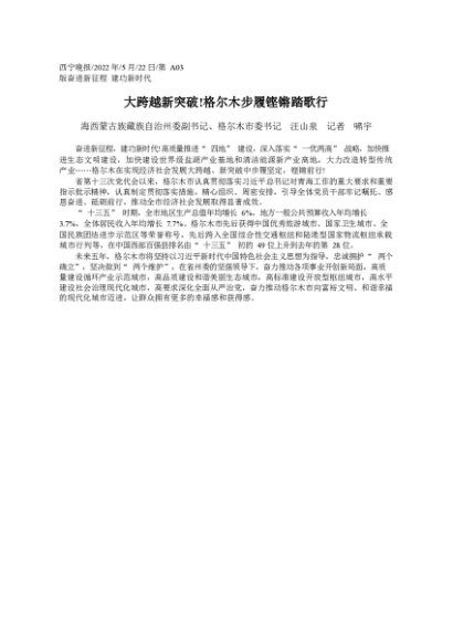 署名文章:2022.05.22海西蒙古族藏族自治州委副书记、格尔木市委书记汪山泉记者啸宇:大跨越新突破!格尔木步履铿锵踏歌行