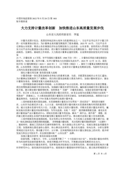 / 署名文章:2022.05.20山东省人民政府副省长李猛:大力支持计量改革创新加快推进山东高质量发展步伐