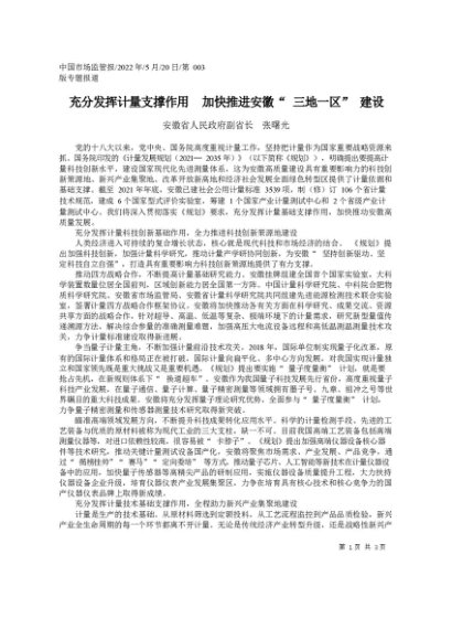 / 署名文章:2022.05.20安徽省人民政府副省长张曙光:充分发挥计量支撑作用加快推进安徽三地一区建设