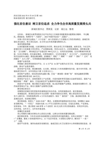 署名文章:2022.05.19新城区委书记贾轶昊记者南江远:强化首位意识树立首位追求全力争当全市高质量发展排头兵