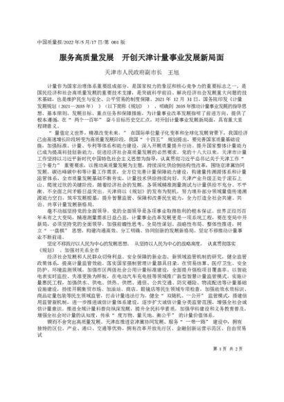 署名文章:2022.05.17天津市人民政府副市长王旭:服务高质量发展开创天津计量事业发展新局面