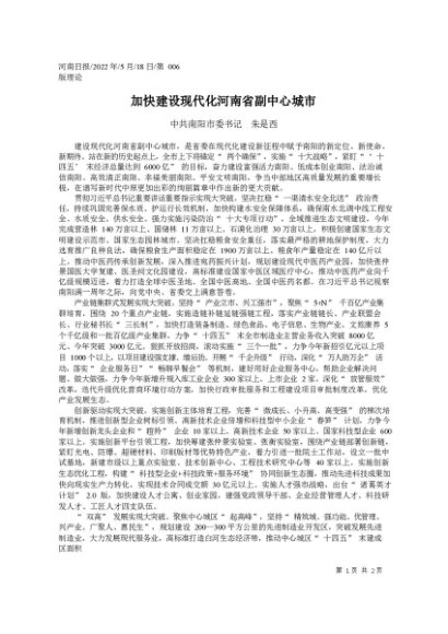 署名文章:2022.05.18中共南阳市委书记朱是西:加快建设现代化河南省副中心城市