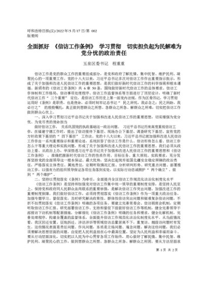 署名文章:2022.05.17玉泉区委书记程重重:全面抓好《信访工作条例》学习贯彻切实担负起为民解难为党分忧的政治责任