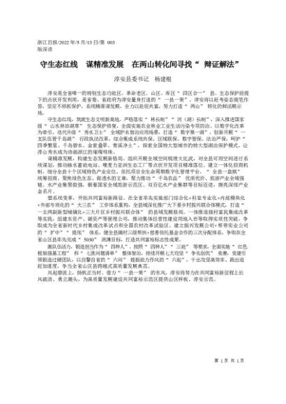 / 署名文章:2022.05.13淳安县委书记杨建根:守生态红线谋精准发展在两山转化间寻找辩证解法