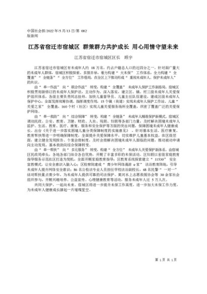 / 署名文章:2022.05.13区长顾宇:江苏省宿迁市宿城区群策群力共护成长用心用情守望未来
