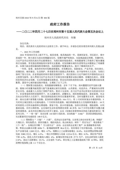 署名文章:2022.05.06郑州市人民政府代市长何雄:政府工作报告