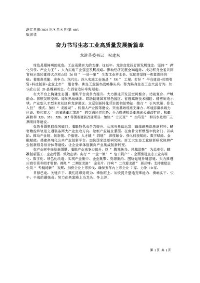 署名文章:2022.05.05龙游县委书记祝建东:奋力书写生态工业高质量发展新篇章