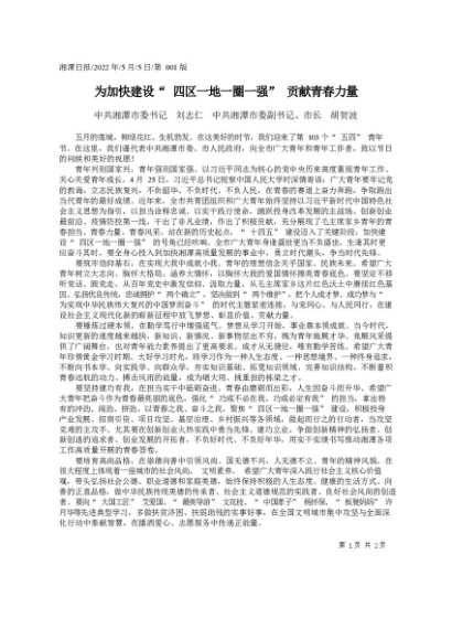 署名文章:2022.05.05中共湘潭市委书记刘志仁中共湘潭市委副书记、市长胡贺波:为加快建设四区一地一圈一强贡献青春力量