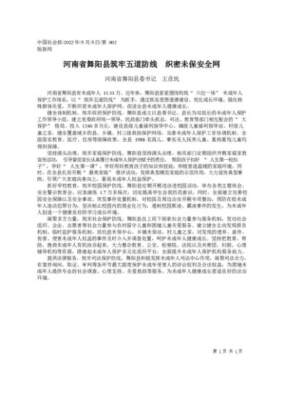 / 署名文章:2022.05.05河南省舞阳县委书记王彦民:河南省舞阳县筑牢五道防线织密未保安全网