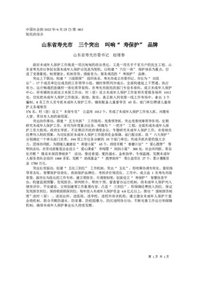 署名文章:2022.04.25山东省寿光市委书记赵绪春:山东省寿光市三个突出叫响寿保护品牌