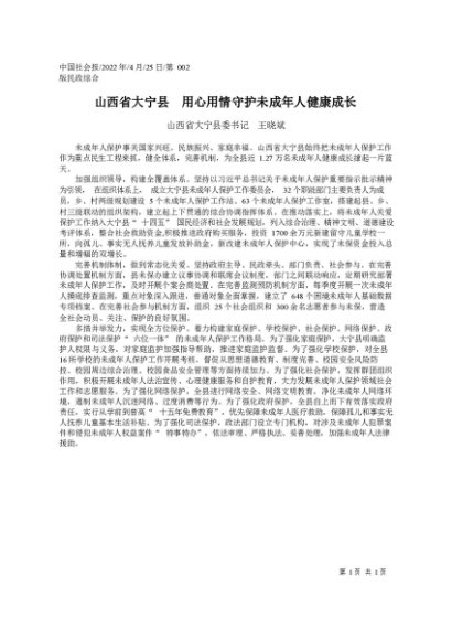 署名文章:2022.04.25山西省大宁县委书记王晓斌:山西省大宁县用心用情守护未成年人健康成长