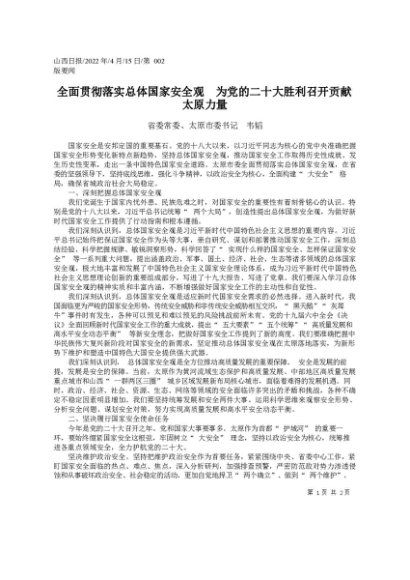/ 署名文章:2022.04.15省委常委、太原市委书记韦韬:全面贯彻落实总体国家安全观为党的二十大胜利召开贡献太原力量
