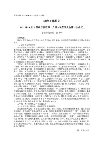 / 署名文章:2022.04.15宁波市代市长汤飞帆:政府工作报告
