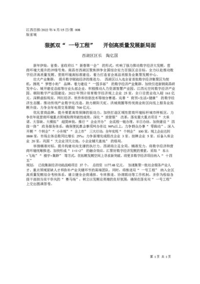 / 署名文章:2022.04.15西湖区区长陶亿国:狠抓双一号工程开创高质量发展新局面