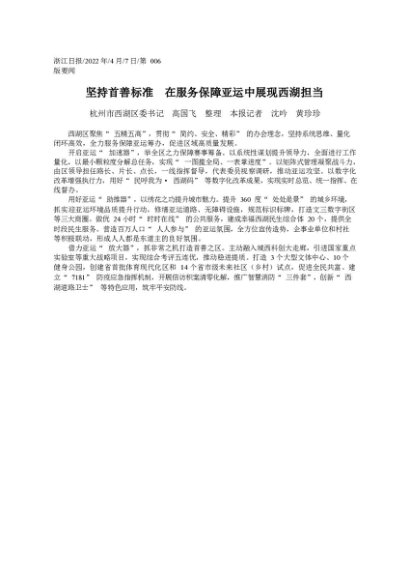 署名文章:2022.04.07杭州市西湖区委书记高国飞本报记者沈吟黄珍珍:坚持首善标准在服务保障亚运中展现西湖担当