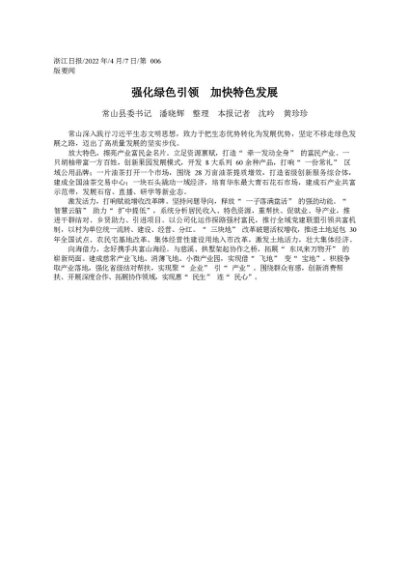 / 署名文章:2022.04.07常山县委书记潘晓辉本报记者沈吟黄珍珍:强化绿色引领加快特色发展