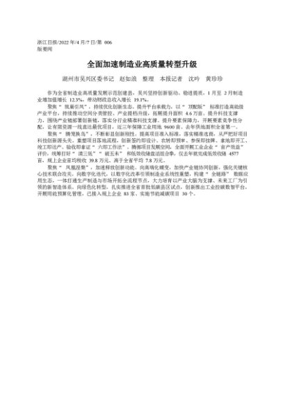 署名文章:2022.04.07湖州市吴兴区委书记赵如浪本报记者沈吟黄珍珍:全面加速制造业高质量转型升级