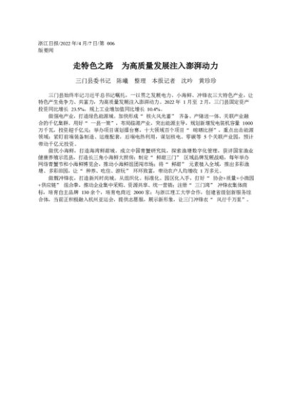 / 署名文章:2022.04.07三门县委书记陈曦本报记者沈吟黄珍珍:走特色之路为高质量发展注入澎湃动力