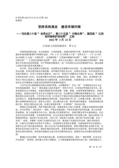 / 署名文章:2022.03.22江西省人民政府副省长罗小云:坚持系统观念建设幸福河湖