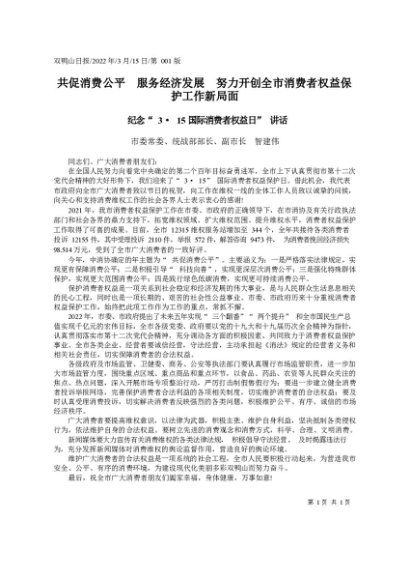 / 署名文章:2022.03.15副市长智建伟:共促消费公平服务经济发展努力开创全市消费者权益保护工作新局面