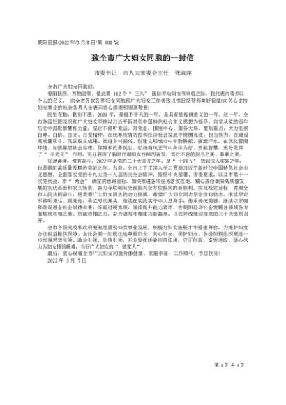 署名文章:2022.03.08市委书记市人大常委会主任张淑萍:致全市广大妇女同胞的一封信