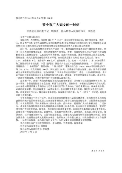 署名文章:2022.03.08中共驻马店市委书记鲍常勇驻马店市人民政府市长李跃勇:致全市广大妇女的一封信