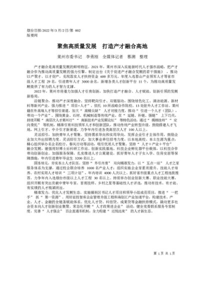署名文章:2022.03.02莱州市委书记李勇刚全媒体记者慕溯:聚焦高质量发展打造产才融合高地
