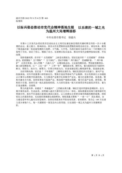 署名文章:2022.03.04中共乐清市委书记徐建兵:以标兵姿态推动市党代会精神落地生根以乐清的一域之光为温州大局增辉添彩