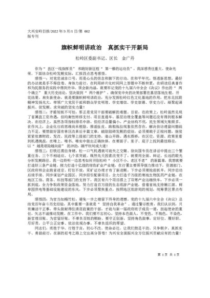 / 署名文章:2022.03.01松岭区委副书记、区长金广丹:旗帜鲜明讲政治真抓实干开新局