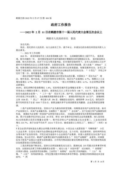 / 署名文章:2022.02.17鹤壁市人民政府市长郭浩:政府工作报告
